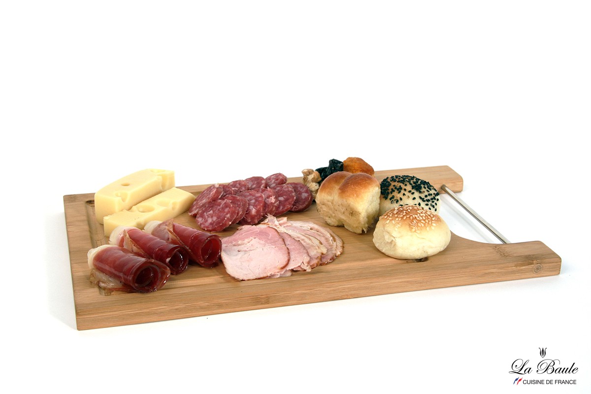 Tabla de bamboo con decantador para usar con picadas, carnes o vegetales.Manija lateral de acero inoxidable.Medida Base: 36 x 21 cms.