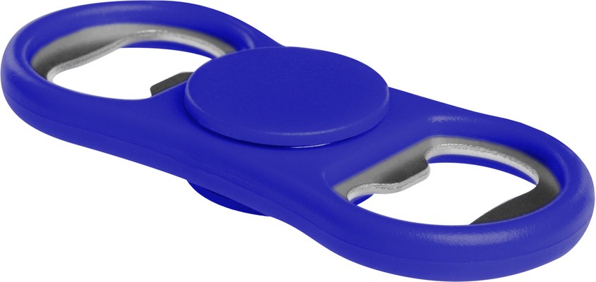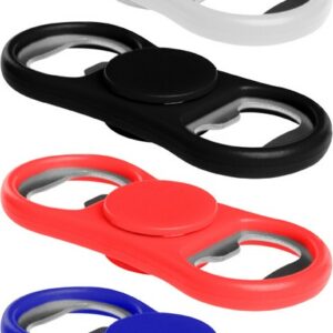 8,5 x 3,5 x 1 cm. Plástico y metal. Destapador doble. En el centro tiene un eje para hacerlo girar.