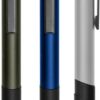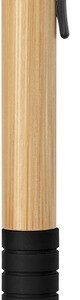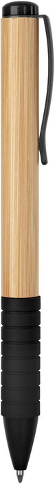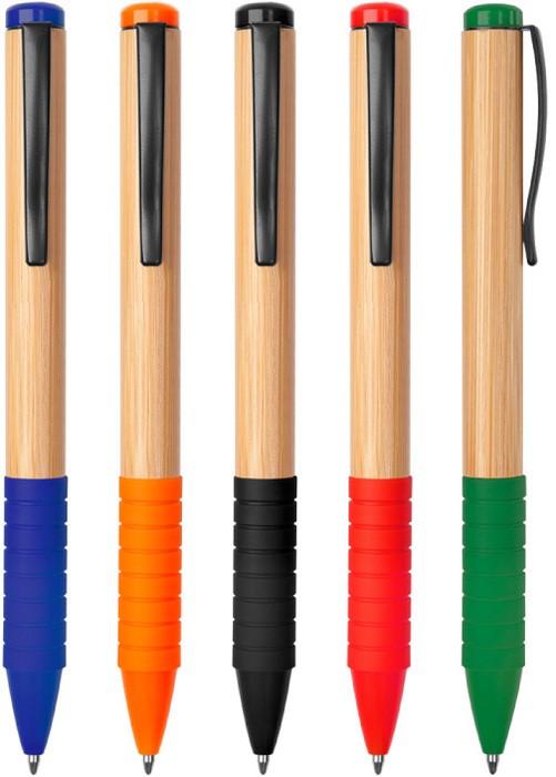Bambú. Cuerpo de madera. Grip de goma, puntera y botón en la parte de arriba en color. Apertura giratoria. Clip negro metálico. Pasta negra.