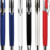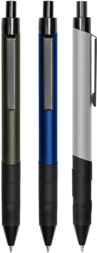 Metálico. Pulsador, clip y puntera de plástico negro. Grip de goma negro. Cuerpo de color. Pasta negra.