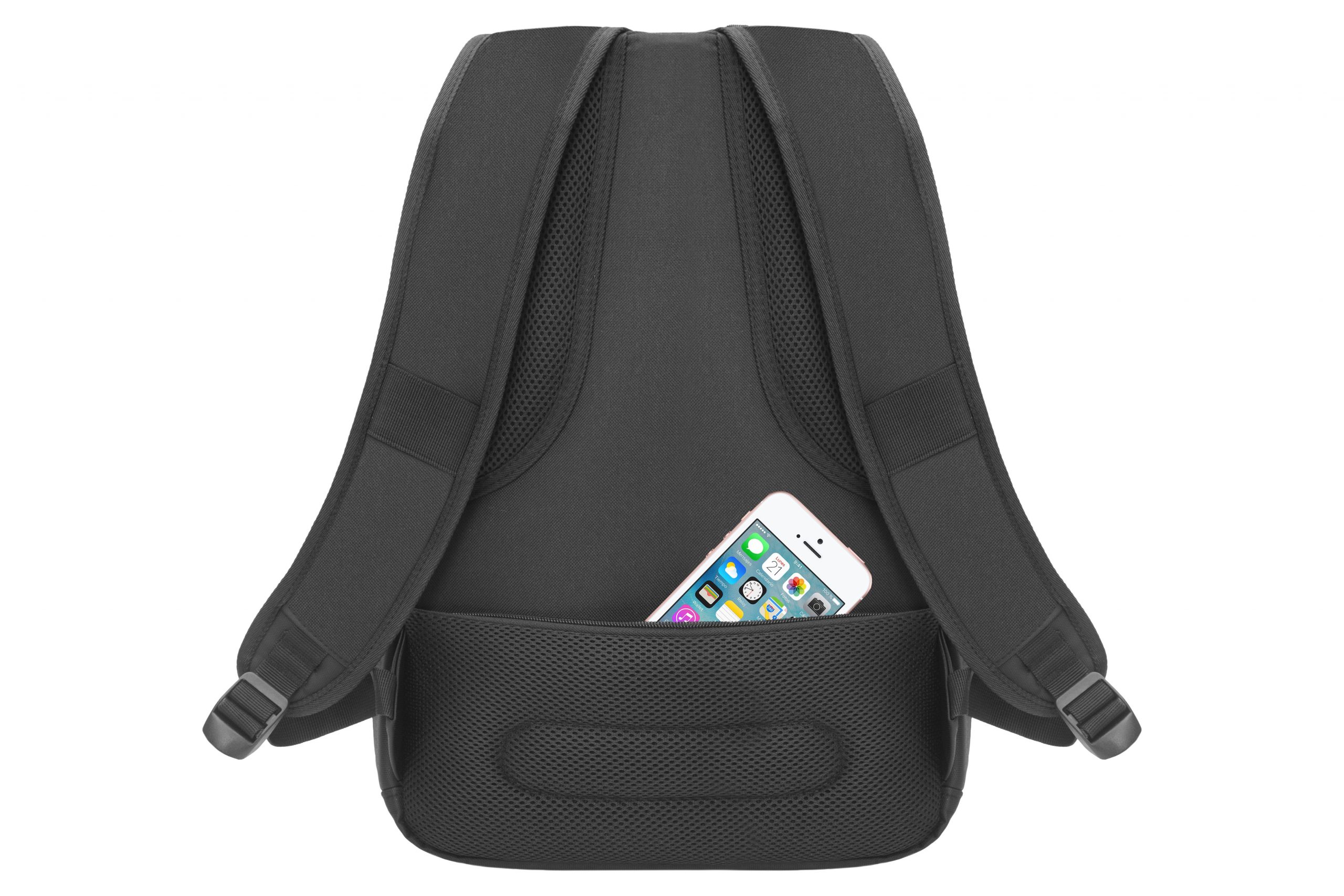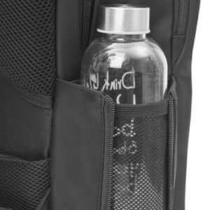 45 x 30 x 9 cm. Capacidad 12 litros. Polyester. Mochila con dos bolsillos externos que permite guardar el cierre dentro de la costura para que no se vea. Cuenta con tres compartimentos, el primer compartimento cuenta con dos espacios para guardar celular y bolígrafos. Segundo compartimento acolchado, un bolsillo con cierre y 3 bolsillos pequeños. Tercer compartimento acolchado. Parte posterior acolchada con red que permite la ventilación de la espalda y un bolsillo pequeño con cierre. En los laterales dos bolsillos de red que se encuentran cubiertos por polyester con cierre. Los tiradores del cierre son metálicos.